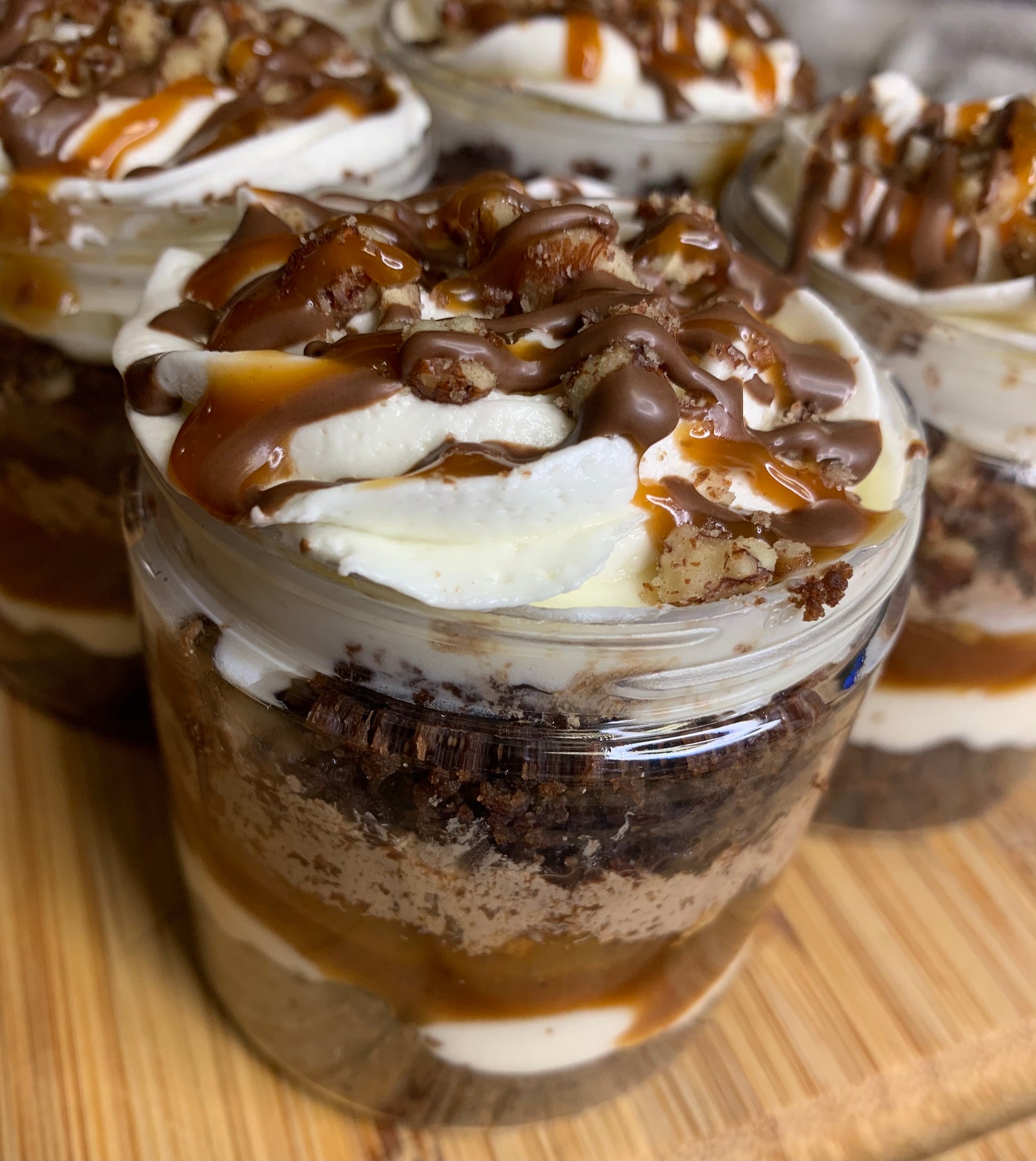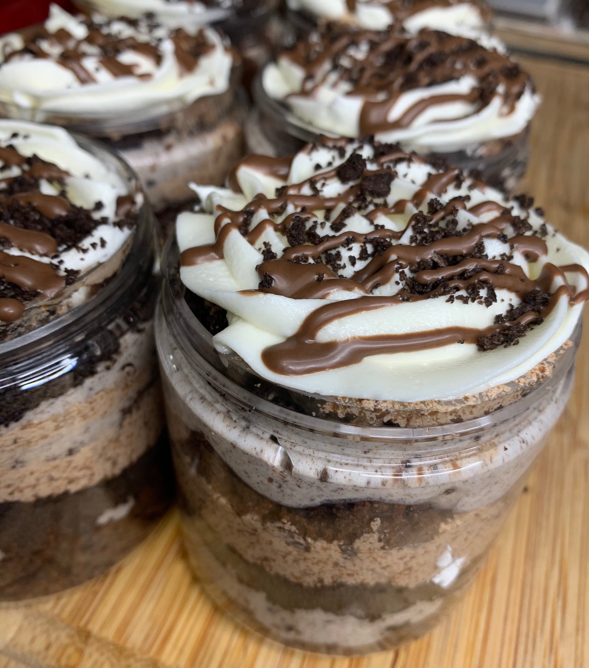 Each jar contains a generous layer of cake, frosting, cheesecake and/or filings.